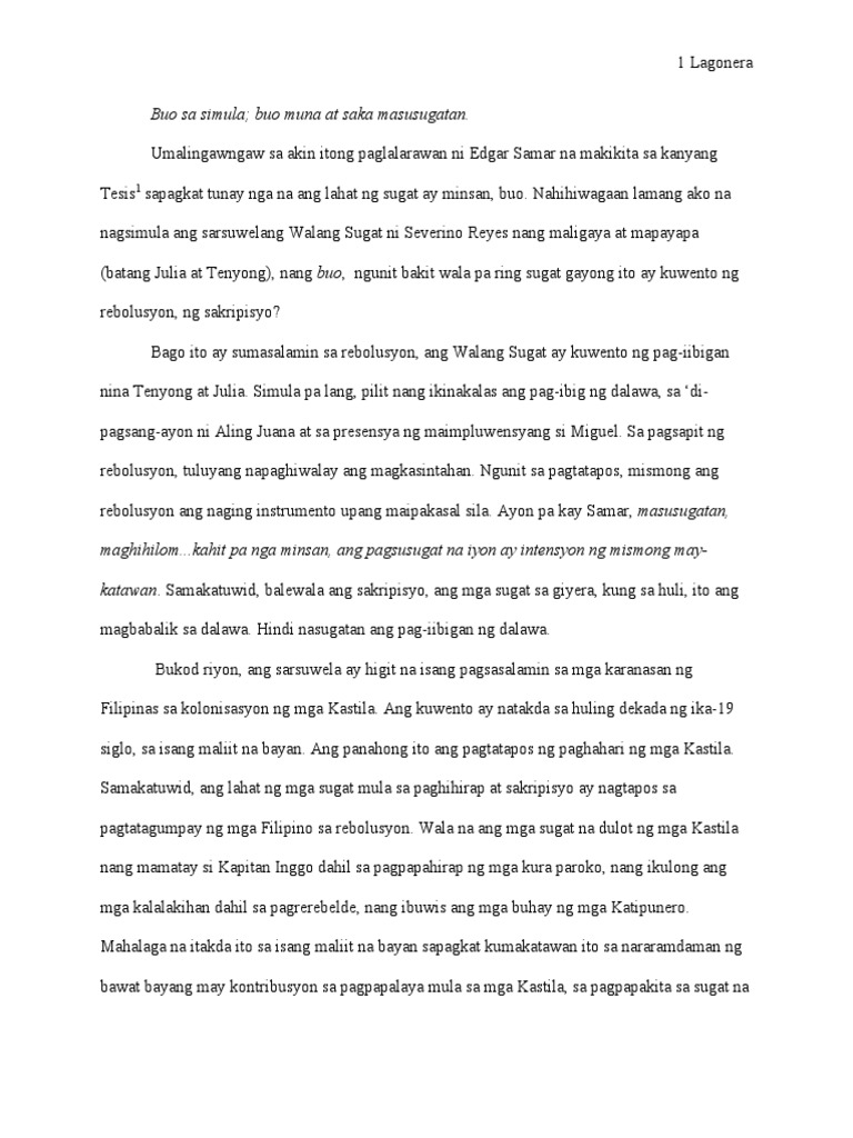 Walang Sugat Severino Reyes 1898 Buod batay sa Pineda 1979 Unang Yugto 1. Ang mga temang gamit nito ay pagmamahalan sa gitna ng digmaan sakripisyo pagkawalay at kontradiksyon ng indibidwal sa pamilya. Human translations with examples.